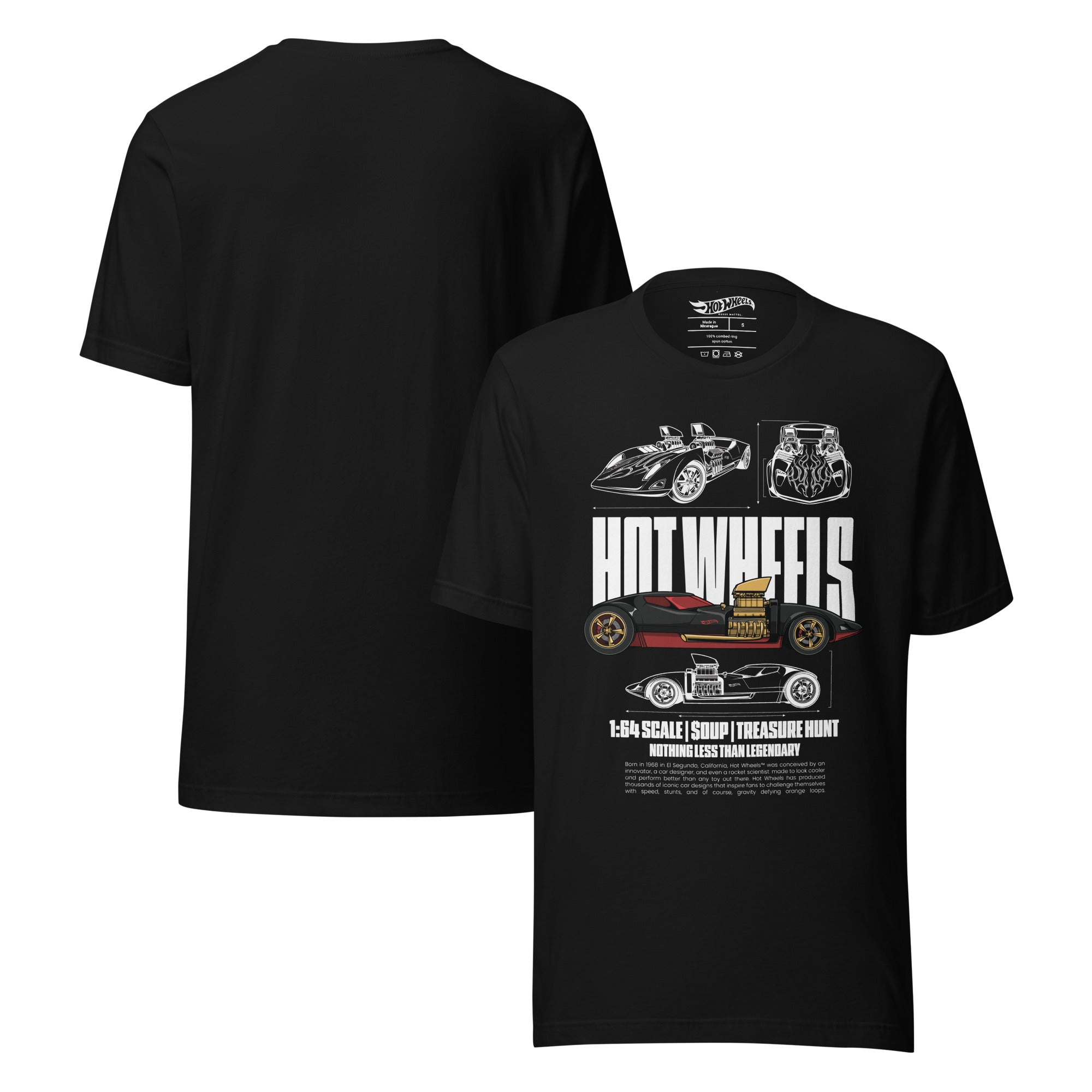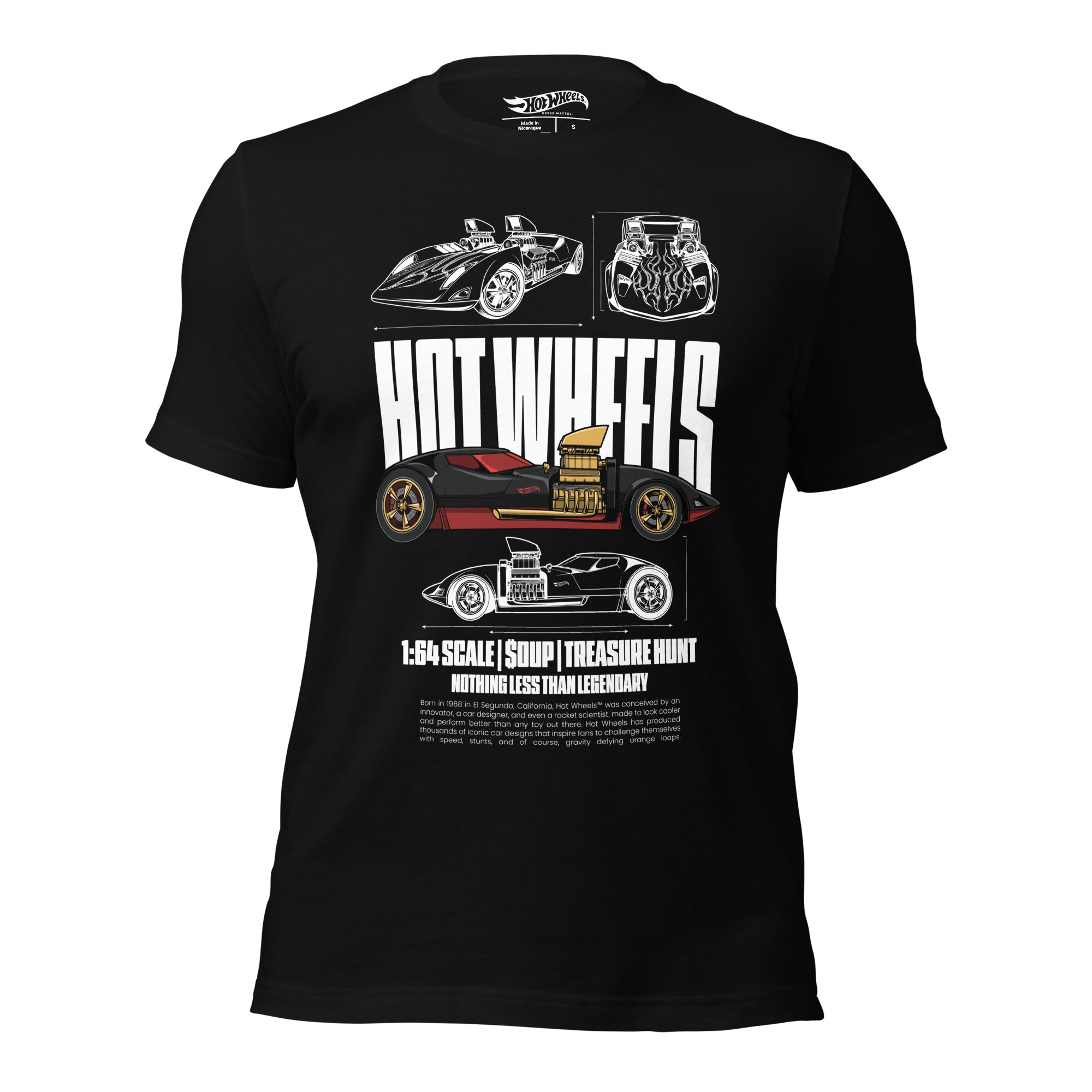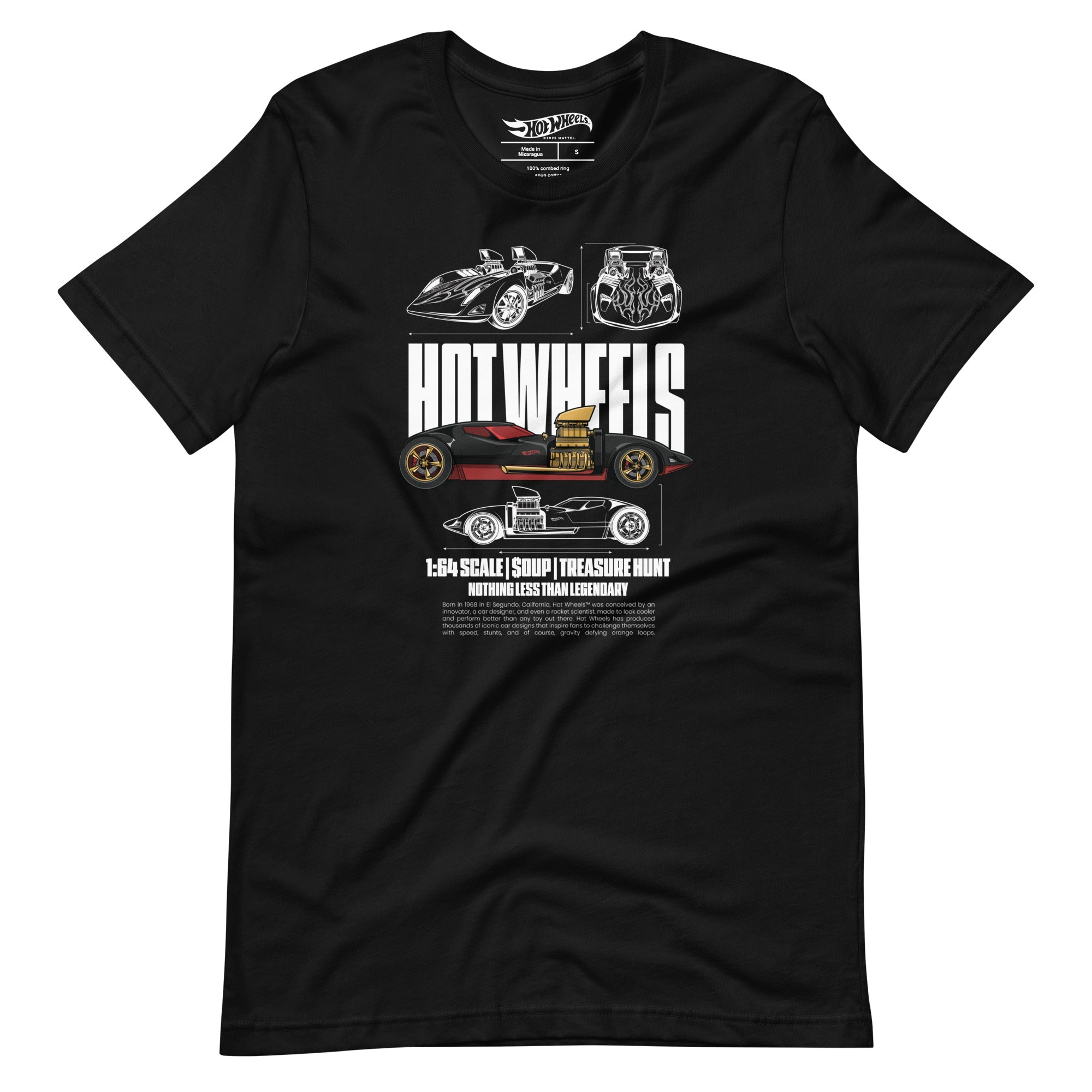 This Hot Wheels Nothing Less than Legendary Black T-Shirt is everything you’ve dreamed of and more. It feels soft and lightweight. with the right amount of stretch. It’s comfortable and flattering for all. This exclusive Hot Wheels design is only available through Mattel Creations.