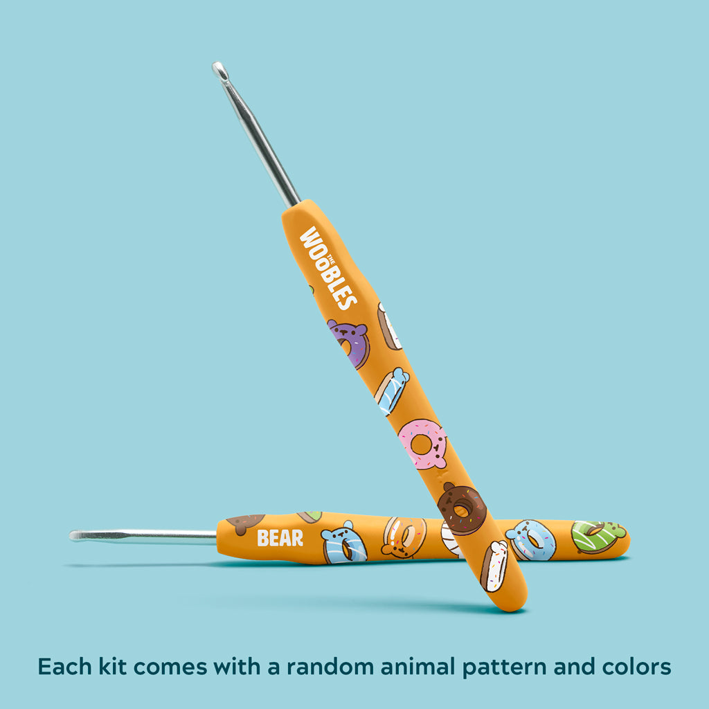 Each kit comes with a random custom hook. pattern. and colors to make one full-sized animal mystery donut.